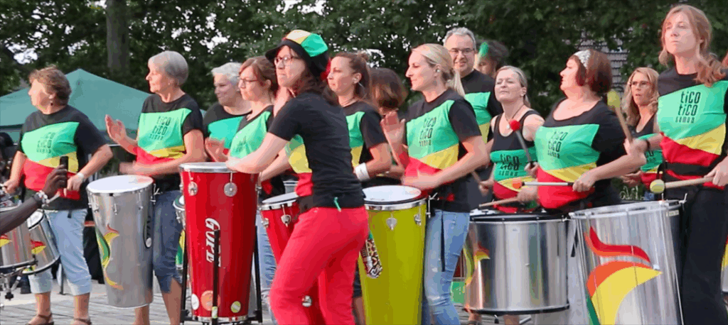 Wir „Ticos“ haben uns dem Samba Reggae verschrieben – Musik aus Bahia in Brasilien. Dabei orientieren wir uns an den großen Blocos aus Salvador: Olodum, Ilê Aiyê, Malê Debalê, Muzenza, Timbalada … und spielen auf Surdos (Fundos, Dobras), Caixas, Repiniques und Timbals.